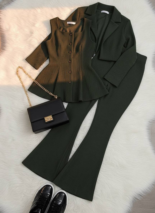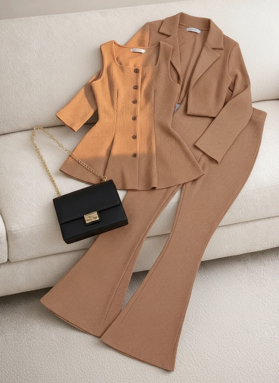مدل: سهتیکه شامل کت کوتاه، جلیقه دکمهدار و شلوار راسته دمپا گشاد